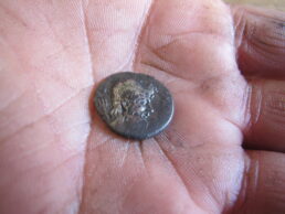 Roman artefacts that have been dug up in the vineyards of Château Courac - a coin minted in Sicily